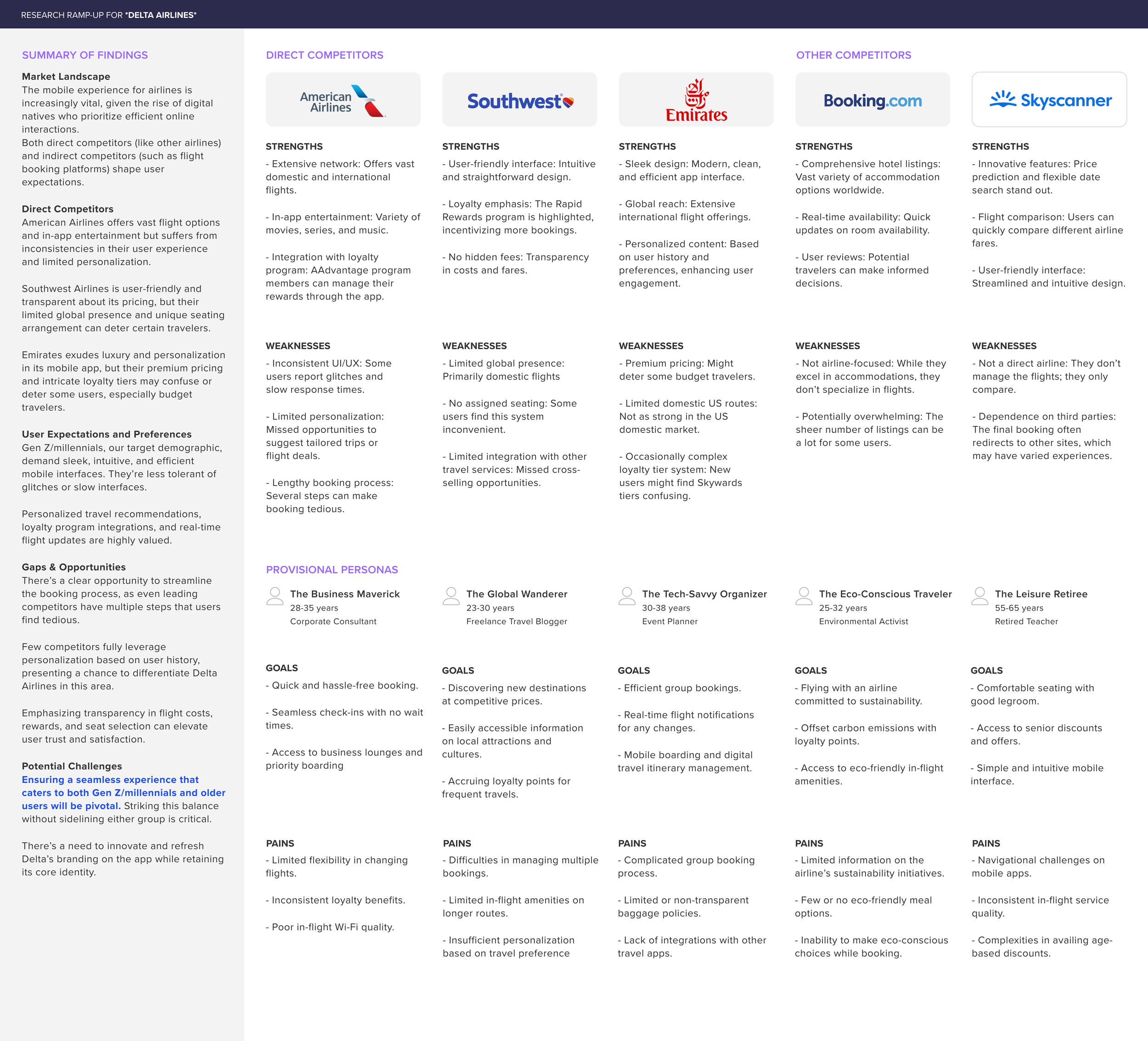 Overview: The research phase included not only user interviews but also an analysis of market trends and competitor benchmarks. This comprehensive approach helped me identify key areas for improvement in the Delta mobile app.